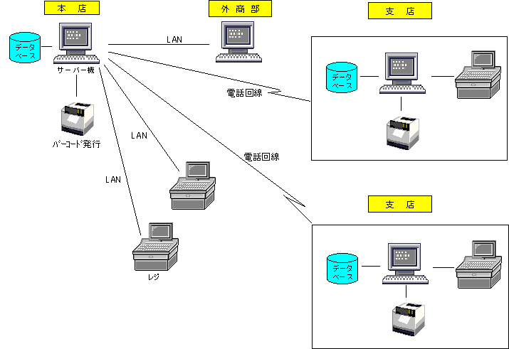 他店舗とネットワーク ・ 本店のサーバ機から他店舗の情報が照会できる。